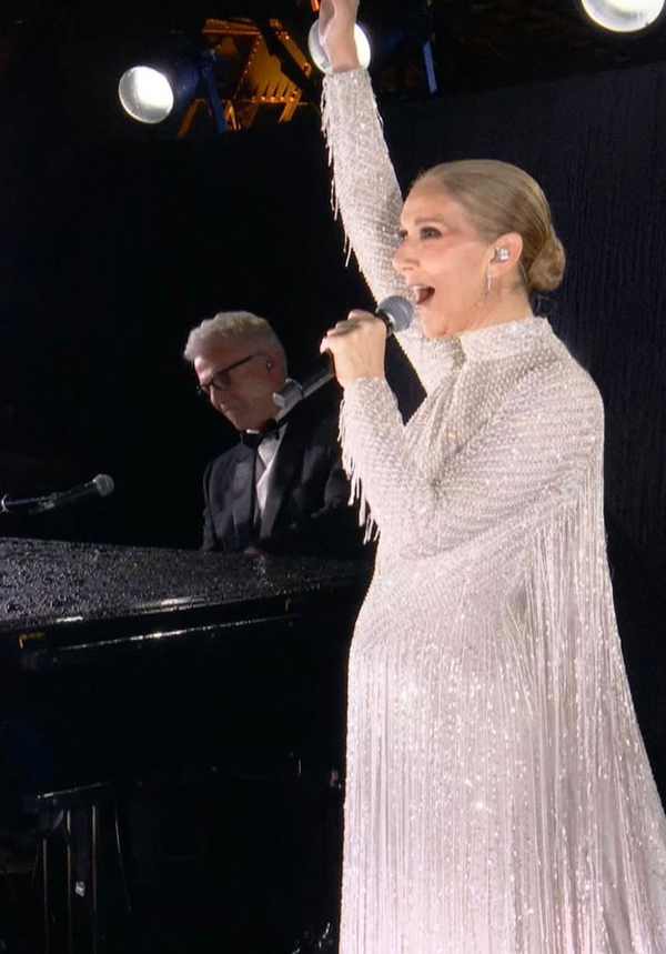 Perched high on the Eiffel Tower for her grand comeback was legendary icon Celine Dion, astounding in a pristine silk georgette, beautifully embroidered with decadent sequins and piercing sparkles. The gown’s flowing silhouette and elegant draping highlighted Celine Dion’s statuesque figure, exuding grace and sophistication.