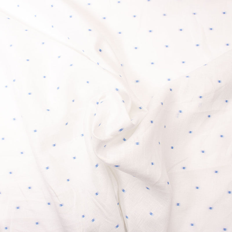 A sky blue spotted superfine white pure linen fabric. Creasing elegantly, this lightweight and breathable cloth provides an excellent coolness for the hotter weather making it the perfect choice for summer shirting, dresses and shorts.