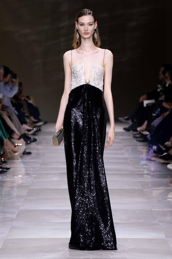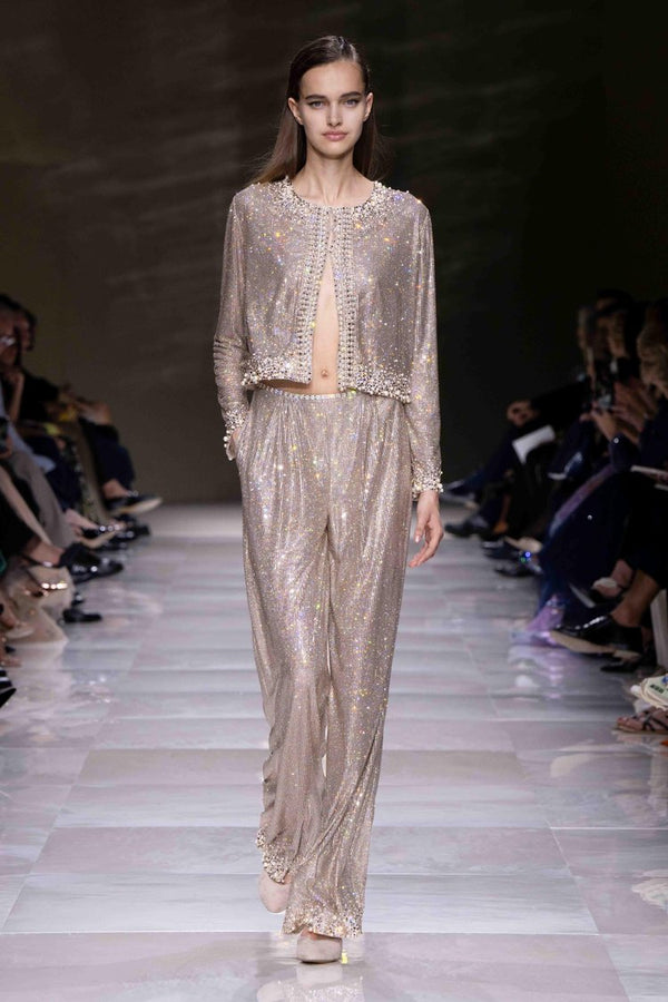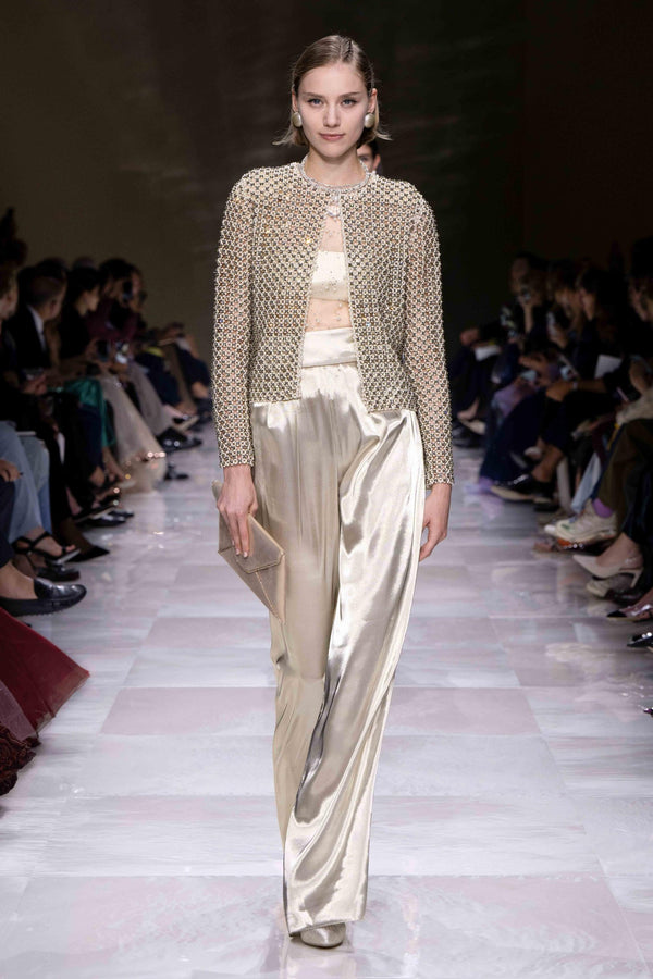 Armani’s collection featured exquisite embroidery detailing with pearls. The embroidery added depth and texture to the garments, demonstrating a balance between simplicity and intricate detail.