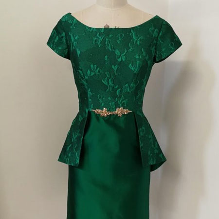 How gorgeous is this emerald green peplum style set? Anne has used a cloqué fabric for the top (see one very similar below) and a silk duchess satin for the skirt.