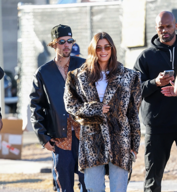Hailey Bieber: Wearing a Saint Laurent jacket with large shoulder pads