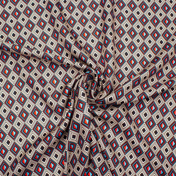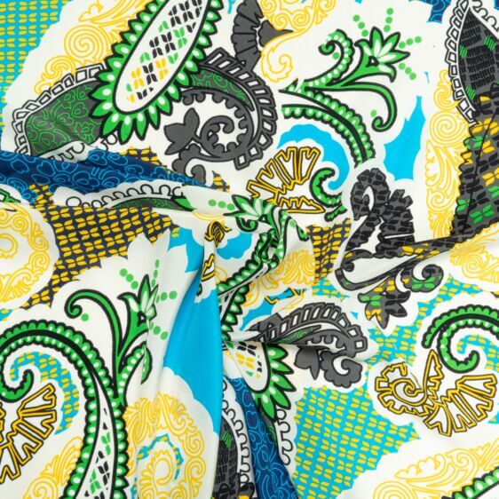 A tear-drop shaped, fancy printed pattern, used in dresses, blouses, and men's ties.