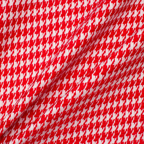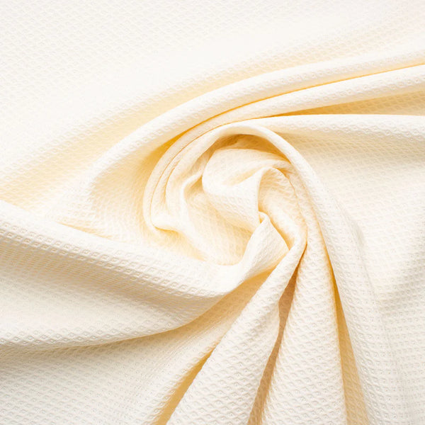 A medium-weight fabric, either knit or woven, with raised dobby designs including cords, wales, waffles, or patterns. Woven versions have cords running lengthwise, or in the warp direction. Knitted versions are double-knit fabric constructions, created on multi-feed circular knitting machines.