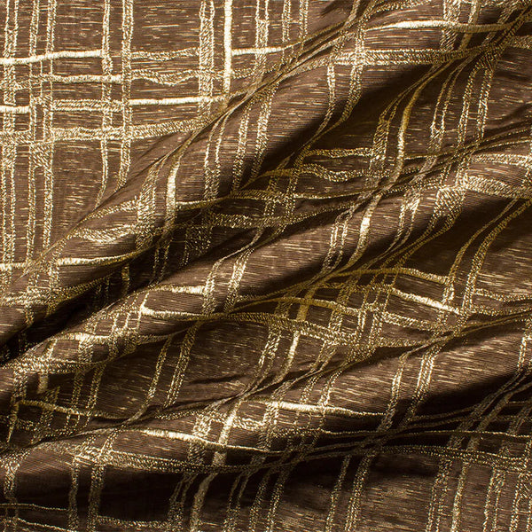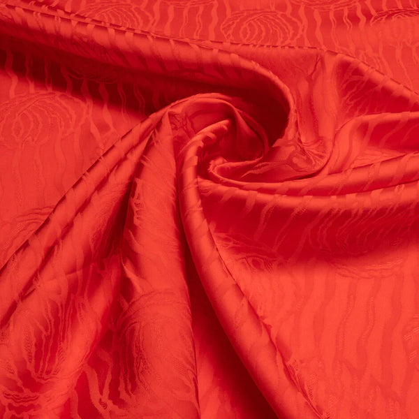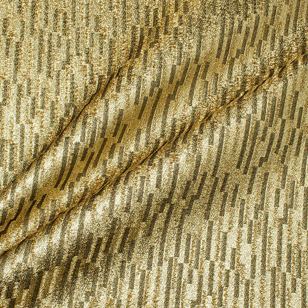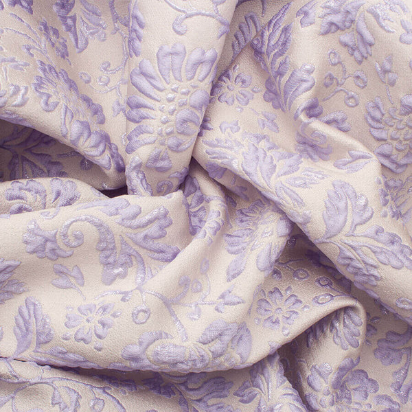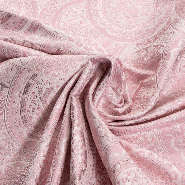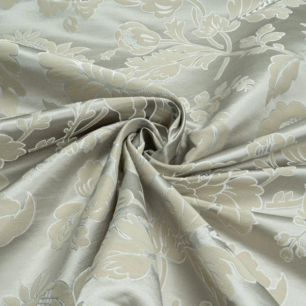 A formal satin base Jacquard fabric of linen, cotton, silk, or wool with reversible patterns. It is medium weight with variety in colours and patterns. Used in decorative fabric situation.