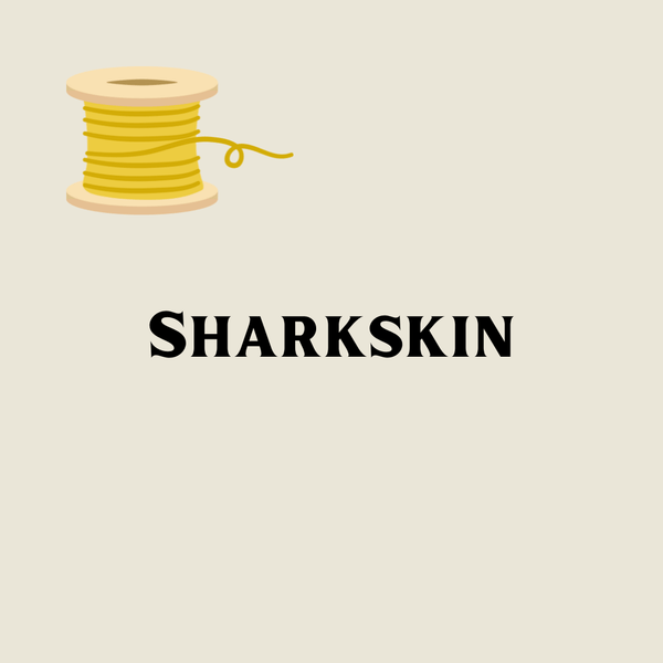 A specific woven or warp-knitted fabric with a distinctive sheen. Sharkskin is a twill weave fabric. Materials used in its construction include: acetate, rayon, worsted wool, lycra, and other plastic fibers.