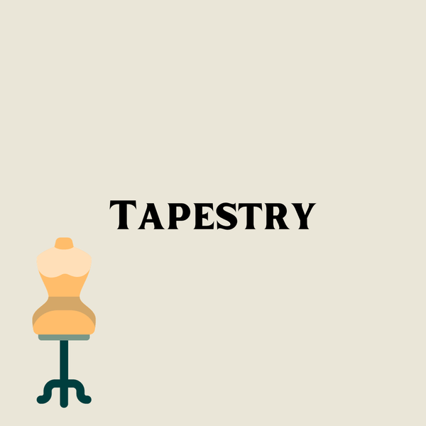 A heavy, often hand-woven, ribbed fabric, featuring an elaborate design depicting a historical or current pictorial display. The weft-faced fabric design is made by using colored filling yarns, only in areas where needed, that are worked back and forth over spun warp yarns, which are visible on the back. End-uses include wall hangings and upholstery.