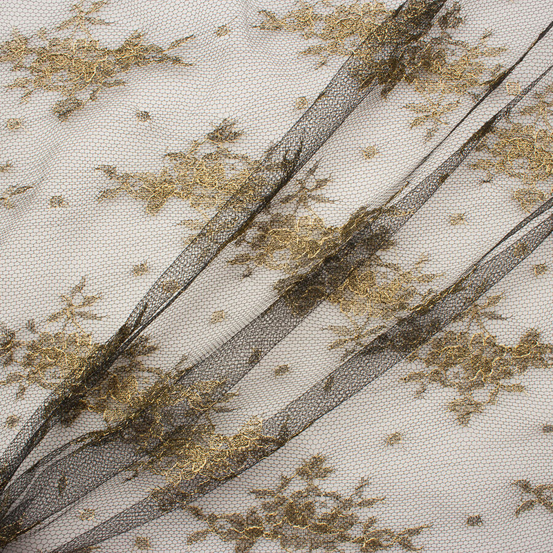 A black and dark gold metallic chantilly lace. Lace is an openwork fabric, patterned with open holes in the work, made by machine or by hand. Dating back as far as the early 15th Century, lace is as popular today as it has ever been. (180cm wide).