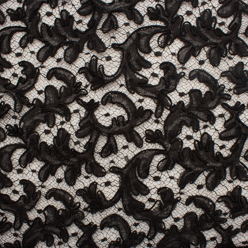 A jet black heavy corded lace. Lace is an openwork fabric, patterned with open holes in the work, made by machine or by hand. Dating back as far as the early 15th Century, lace is as popular today as it has ever been. 90cm wide and available in a variety of colours.