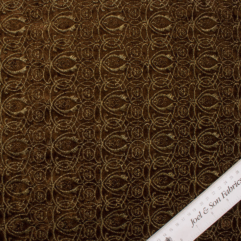 A stunning gold embroidered rich brown velvet. Soft yet durable, this velvet, made in France would be ideal for a duster coat, dress or full floor length skirt.