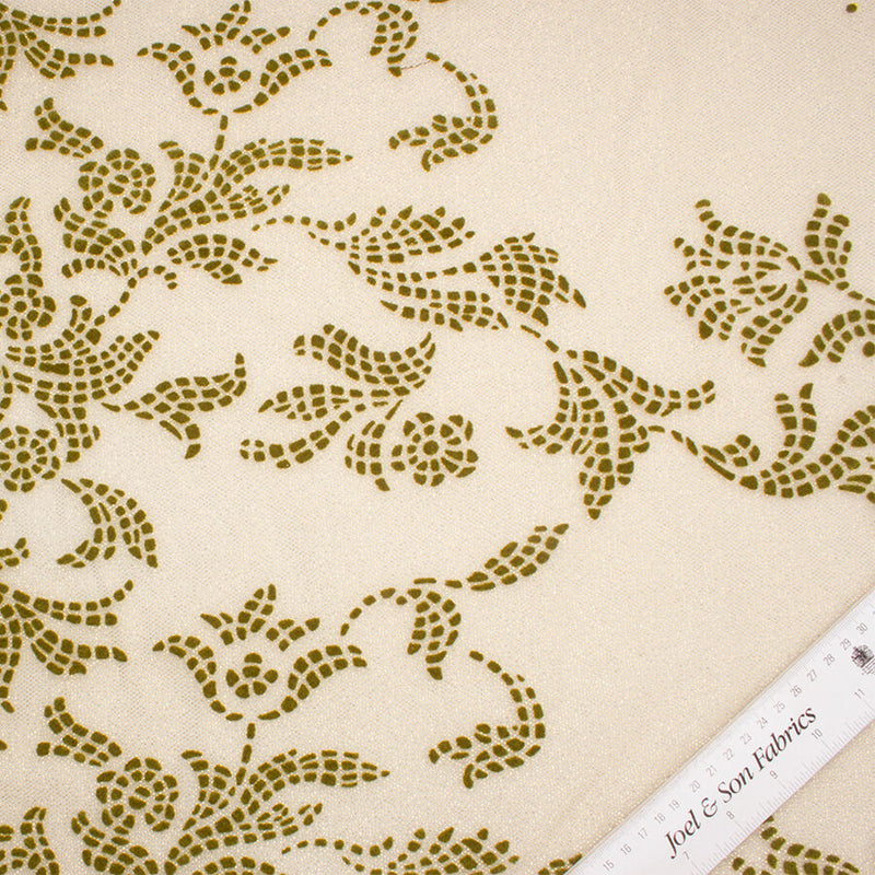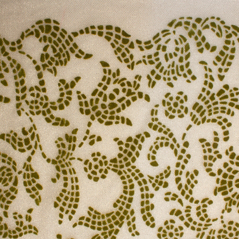 A green flocking on a deep gold tulle. This tulle is lightweight and extremely fine, but lacks the starch nature of tulle, giving it a softer feel and better drape. It is ideal for veils, bridesmaids and as an accompaniment to a dress. Available in a variety of colours and patterns.