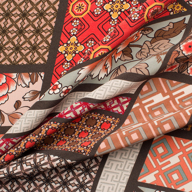 A printed silk crêpe in a vibrant patchwork style design. Perfect for any occasion, this silk is ideal for draped looks, such as dresses, skirts and unstructured jackets. Available in a variety of colours.