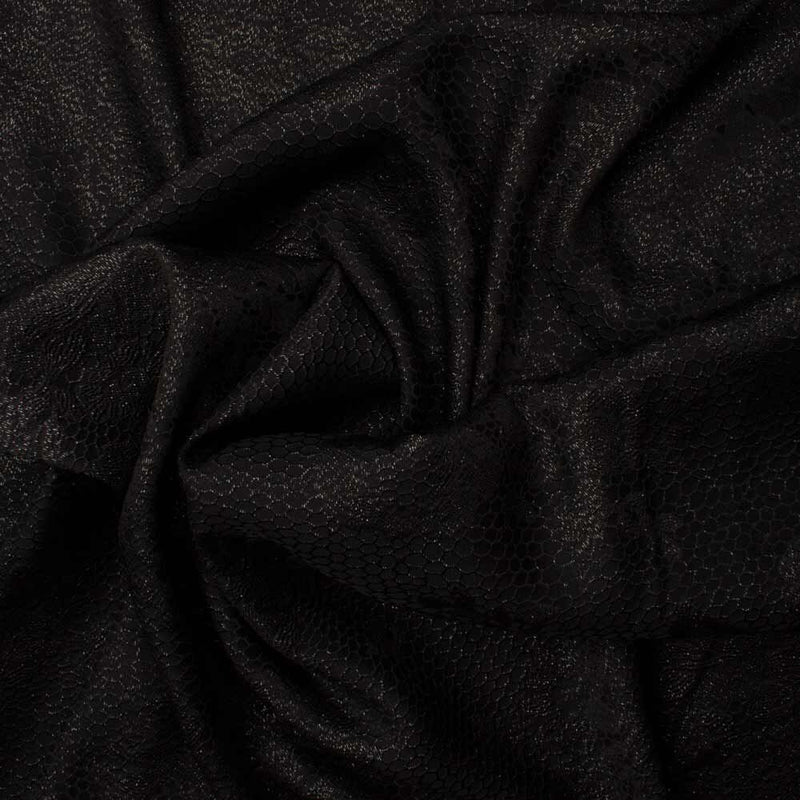 A beautiful silk and acetate mixed fibre black silk cloqué with a delicate metallic floral design. This silk is a subtle but elegant fabric - perfect for a flowing evening dress. Available in a variety of designs.