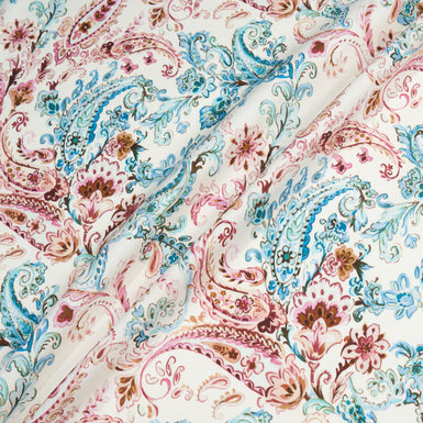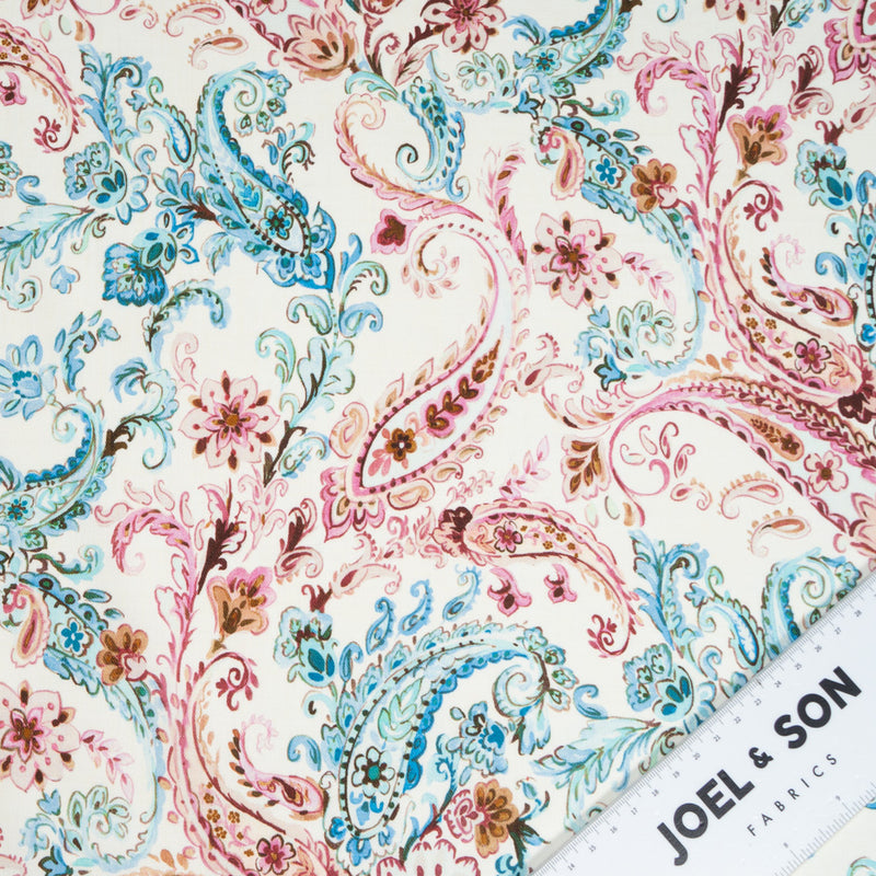 Blue & Pink Paisley Printed Cream Wool & Cotton Blend