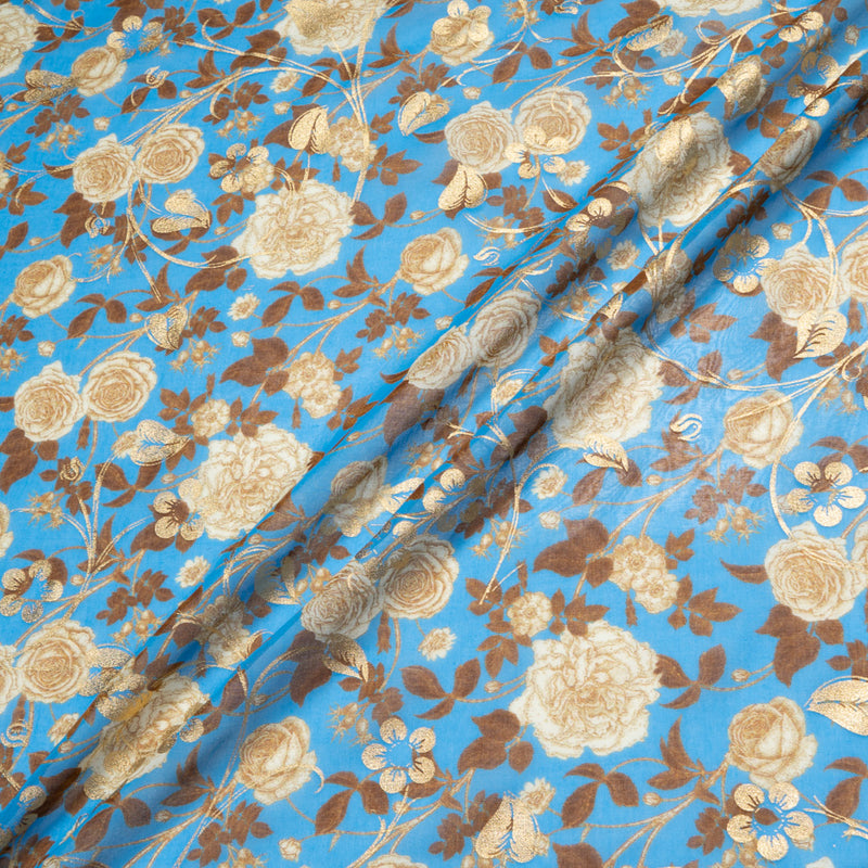 Beige Floral Printed Rich Blue Laminated Cotton Voile