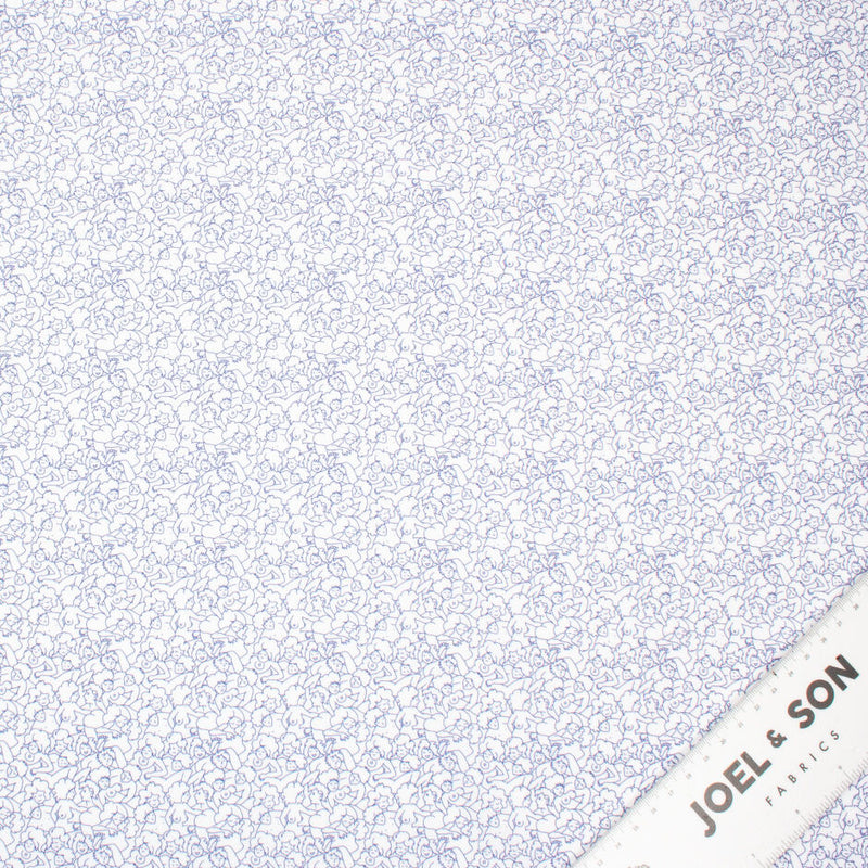 A lightweight white pure cotton with blue unadorned bodies. A soft yet crisp shirting fabric that feels lightweight and breathable. This Italian cotton is the perfect choice for shirting, day or night and can also be used for nightwear.