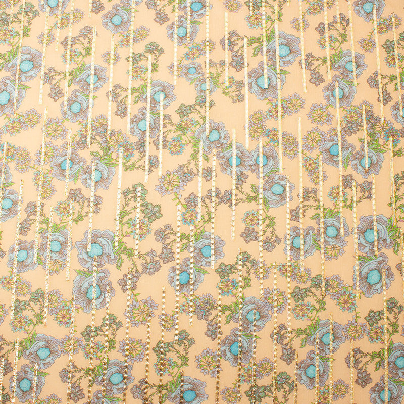 A pretty blue floral printed peach silk chiffon fabric by Chiara Santoni.  Made in Italy, this luxury silk cloth with gold metallic stripe detail is ideal to create a striking feminine and effortless look suitable for flowy maxi dresses, shirts, skirts and scarves. Comes as part of a mix and match collection.