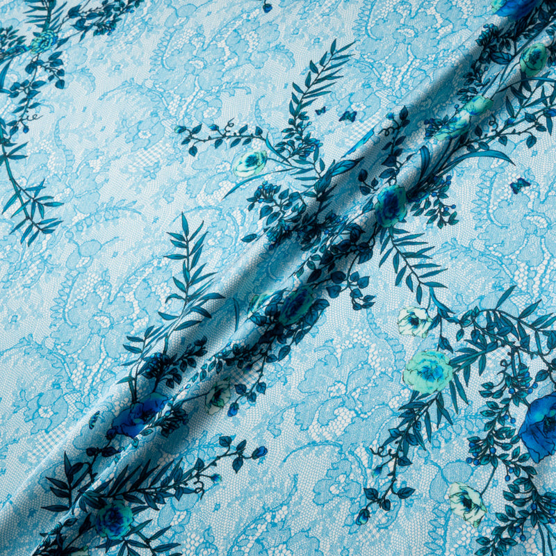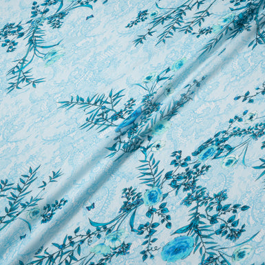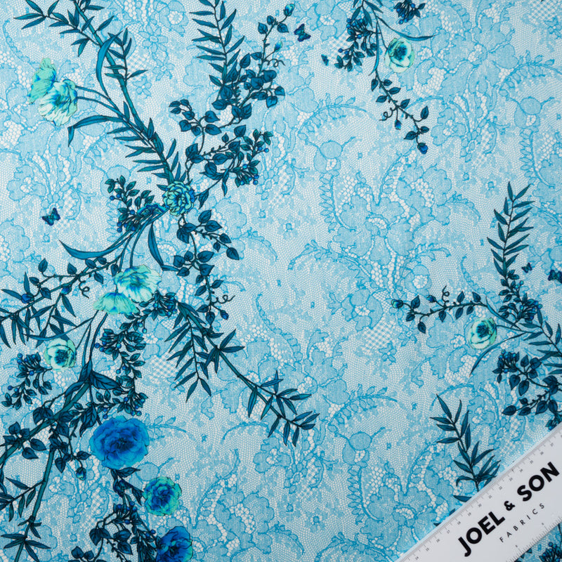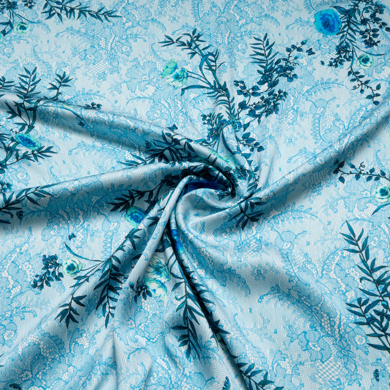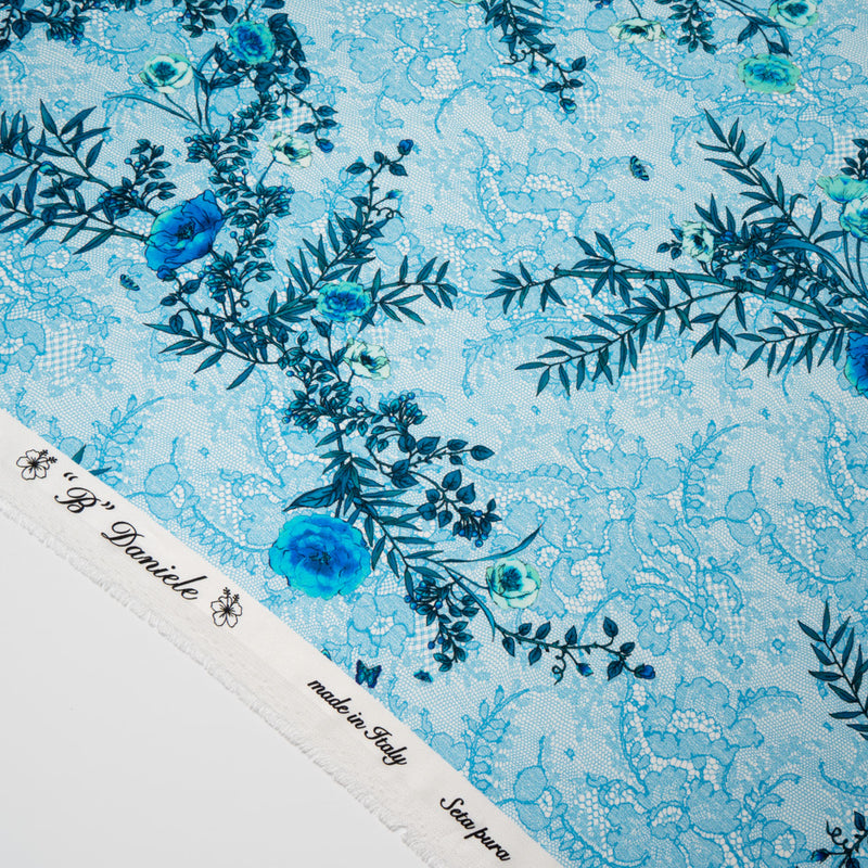 Blue Floral Printed Blue Lace Double Silk Crêpe
