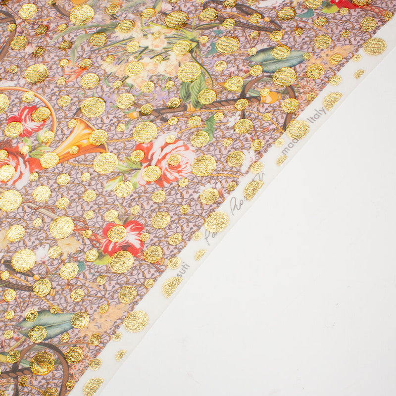 Bold Floral & Ribbon Printed Baby Pink Metallic Silk Georgette