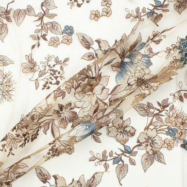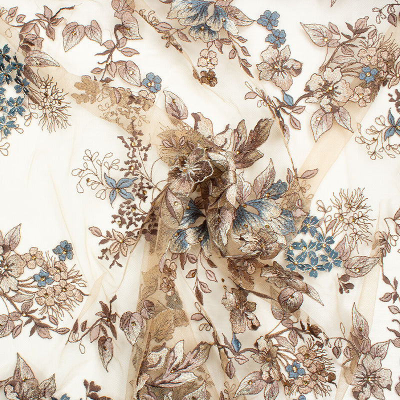Brown & Blue Floral Embroidered Cream Tulle with Stones