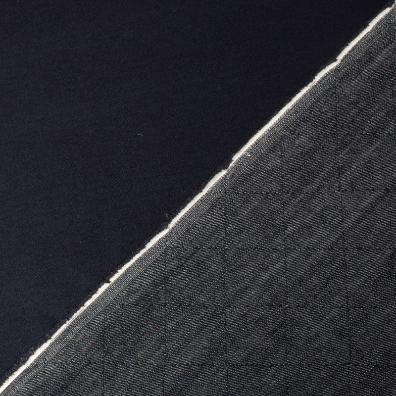 A thicker weight double-faced embroidered indigo blue dyed jersey and denim. Perfect for jackets and duster coats and available in a variety of colour ways.
