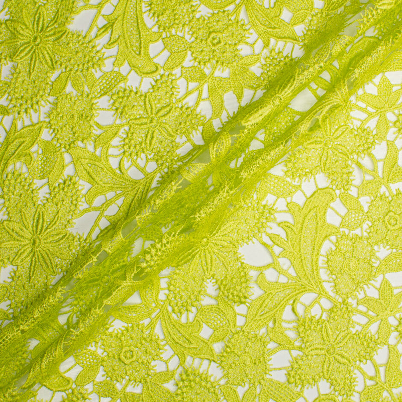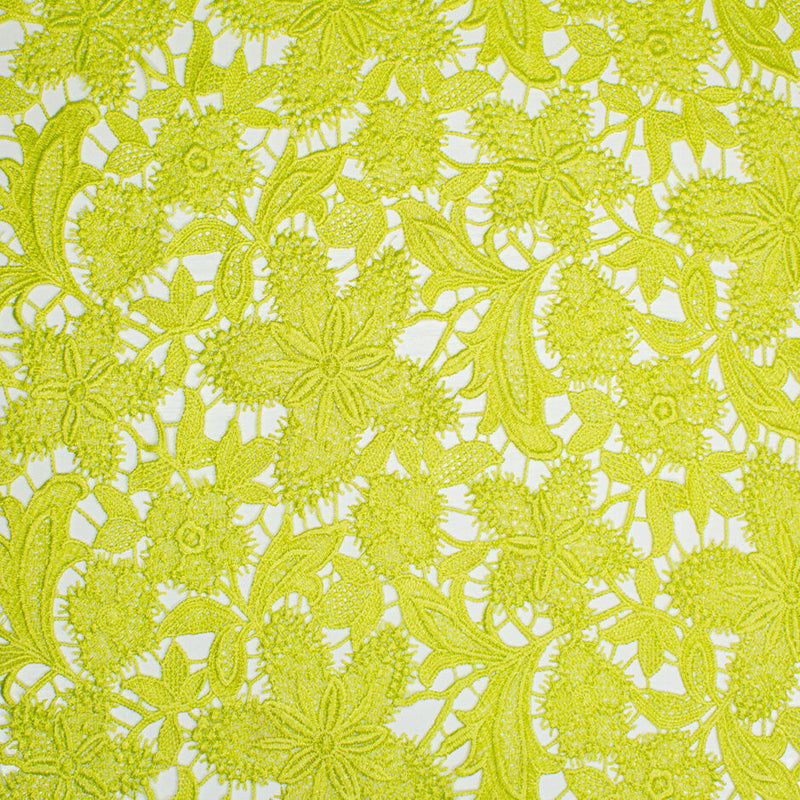 Joel & Son Fabrics are proud to stock a stunning new range of original and reproduced Guipure laces. As seen on many inspiring catwalks recently, these guipure laces are back with a vengeance in many of the designers collections. With more body than traditional laces, this stunning bright lime green floral lace, lined or unlined, would make a stunning dress, bodice or skirt.