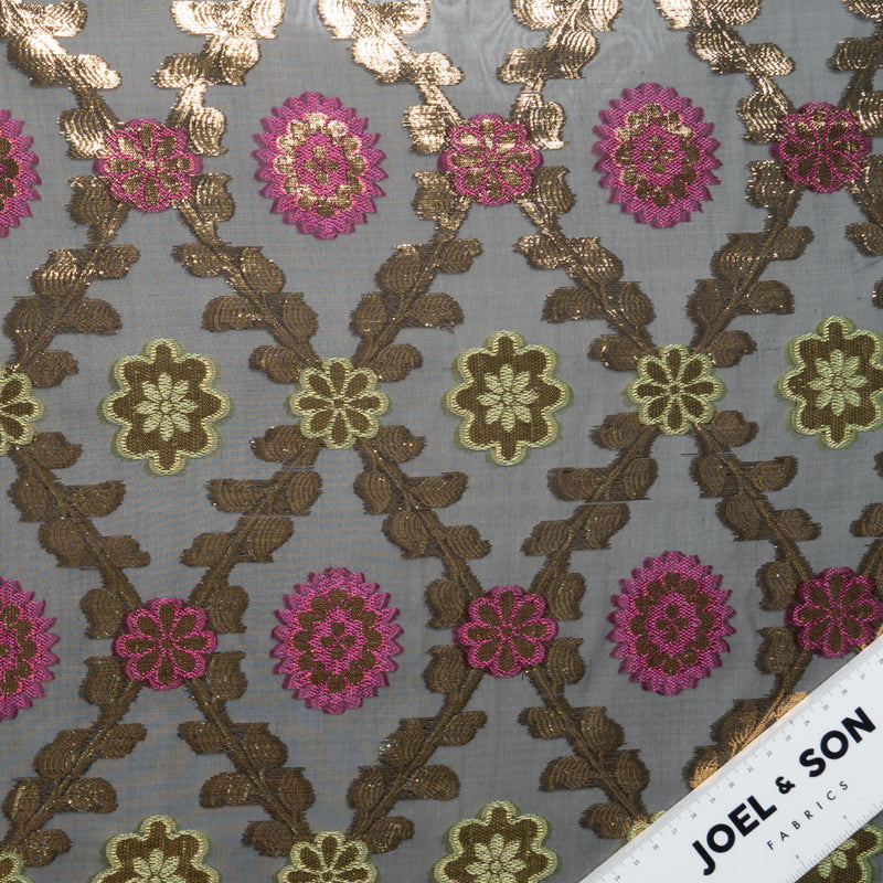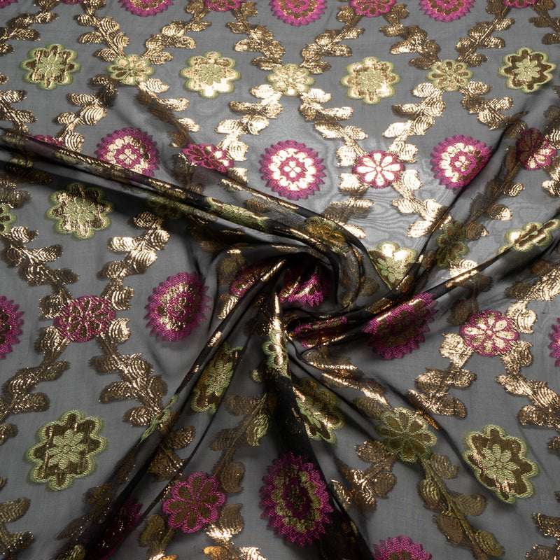 Fuchsia & Gold Floral Jacquard Black Silk Chiffon
