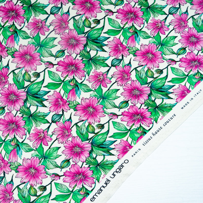 Emanuel Ungaro's use of brightly coloured floral & abstract printed fabrics are highly sought after. Ungaro understood the 'body beautiful' and the luxurious printed and laminated silk twill, brocade, jacquard, crepe, luxury cotton and wool blended fabrics sit in all the right places and drape perfectly. View our selection of curated Emanuel Ungaro printed fabrics.