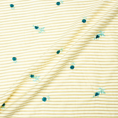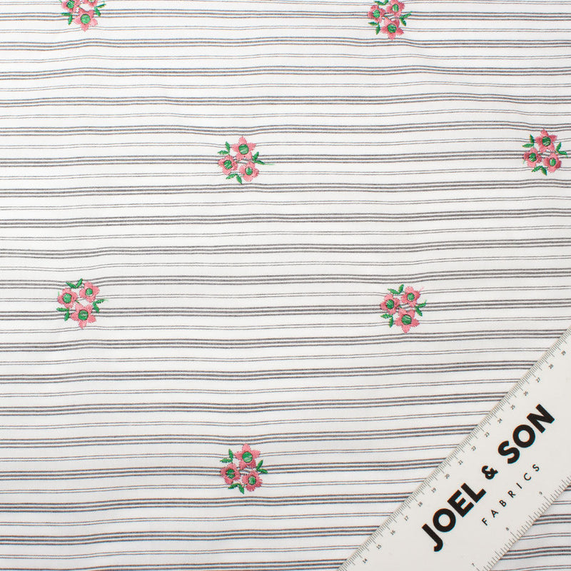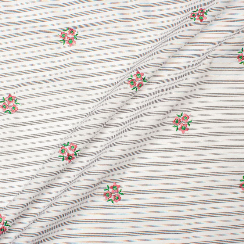 Grey & White Striped Embroidered Cotton