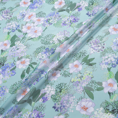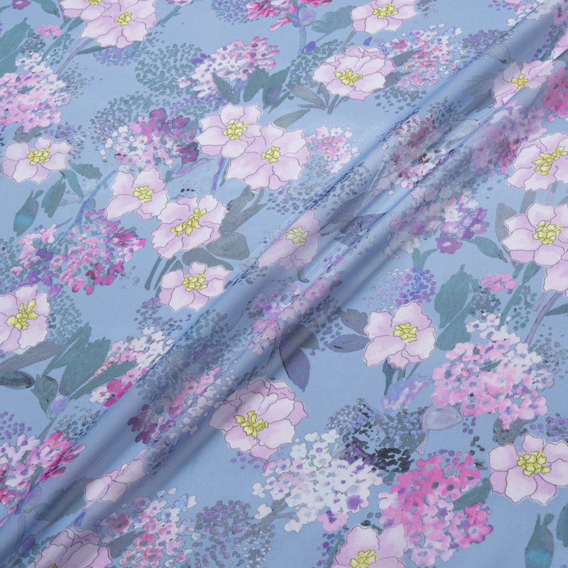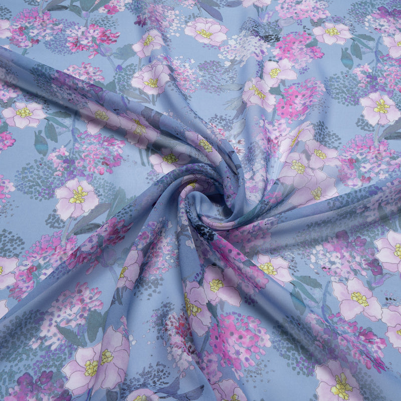 Lilac Floral Printed Dusty Blue Silk Georgette