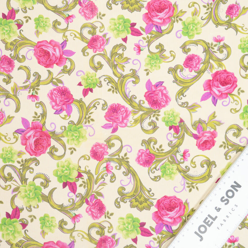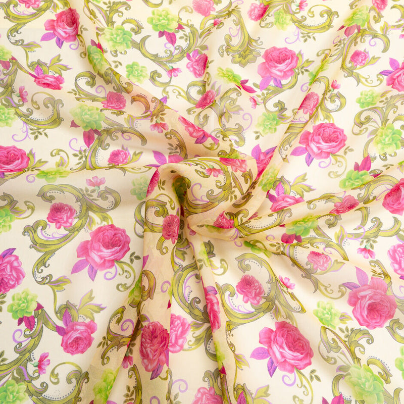 A lime green and pink rose printed soft vanilla pure silk georgette by Abraham. Made in Italy, a lightweight balanced woven sheer fabric. Pure silk georgette is ideal for giving any dress a floating and elegant appearance. The perfect blouse or dress weight.
