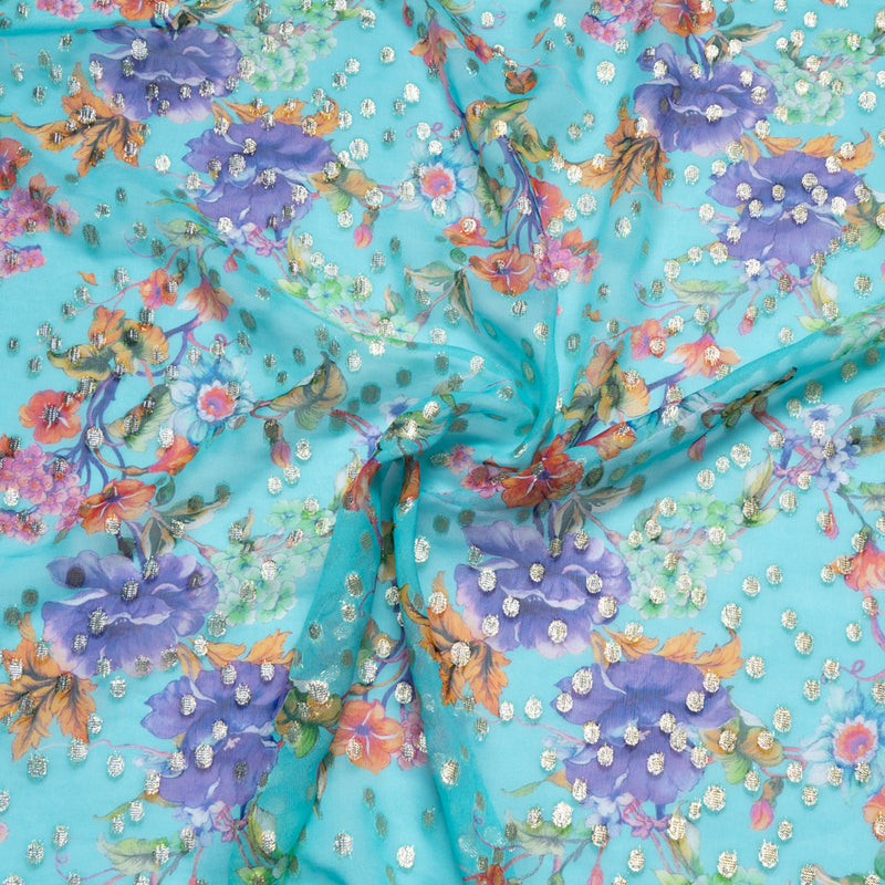 Multi Floral Printed Blue Silk Georgette Jacquard