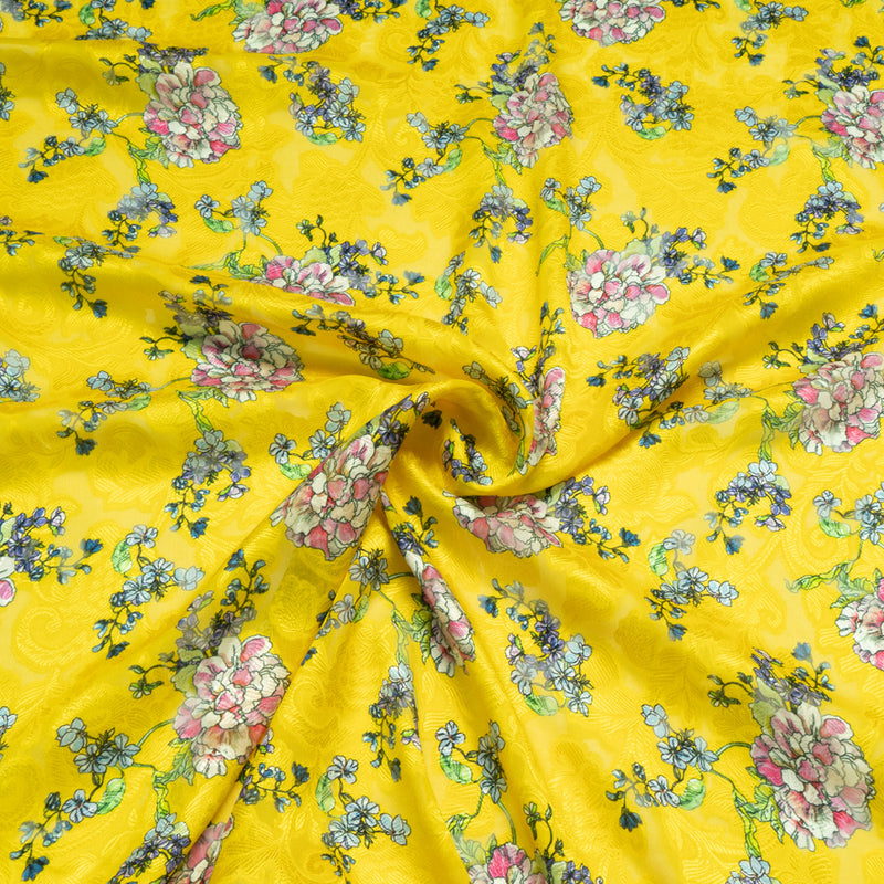 Multi Floral Printed Yellow Silk Jacquard Chiffon