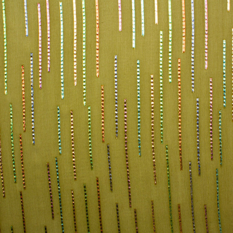 An olive silk georgette fabric with multi-coloured metallic lines. This lightweight and semi-sheer cloth is suitable for garments that require a fluid drape or artful gathers such as saris, pretty flowing dresses, billowing blouses, tops with soft flutter sleeves and more.  Available in a wide variety of colours.