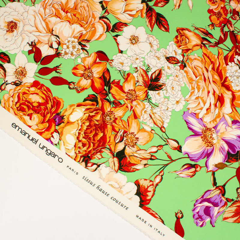Emanuel Ungaro's use of brightly coloured floral & abstract printed fabrics are highly sought after. Ungaro understood the 'body beautiful' and the luxurious printed and laminated silk twill, brocade, jacquard, crepe, luxury cotton and wool blended fabrics sit in all the right places and drape perfectly. View our selection of curated Emanuel Ungaro printed fabrics.
