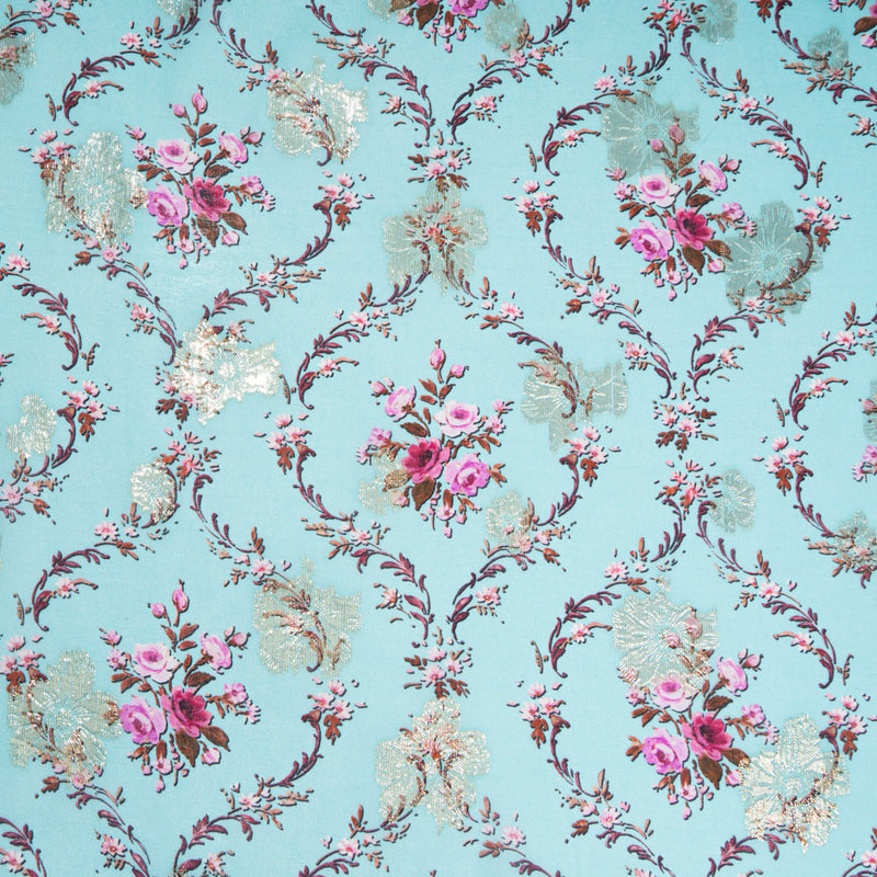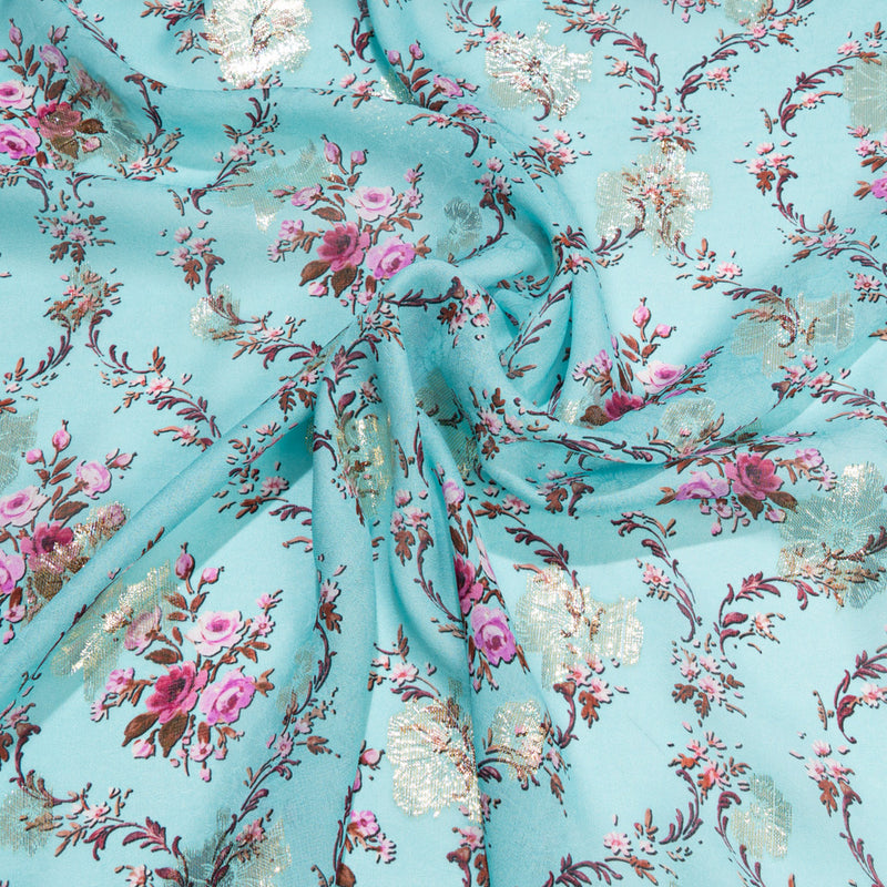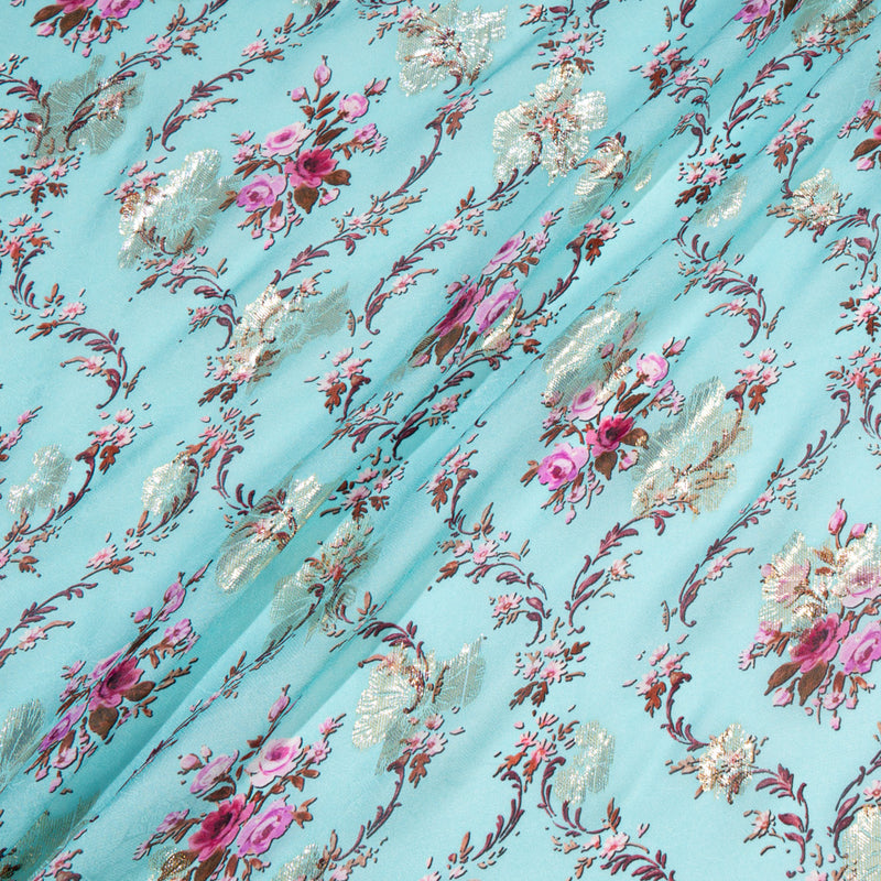 Pink Floral Printed Sky Blue Pure Silk Georgette
