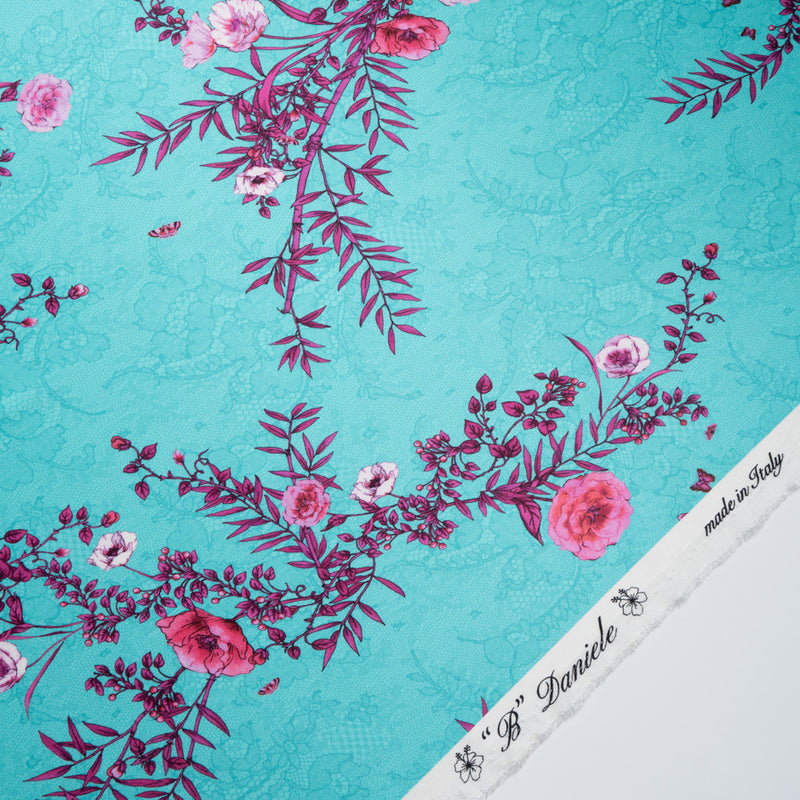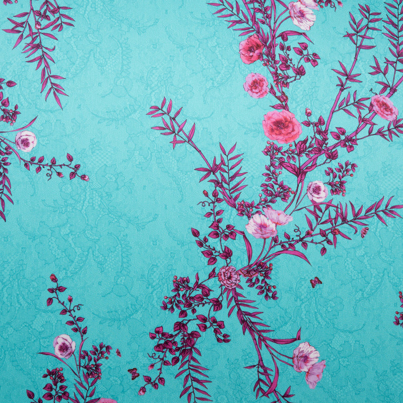 Pink Floral Printed Turquoise Lace Double Silk Crêpe