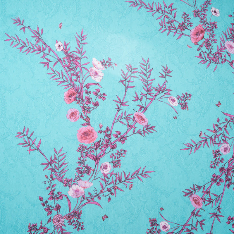Pink Floral Printed Turquoise Lace Pure Silk Chiffon