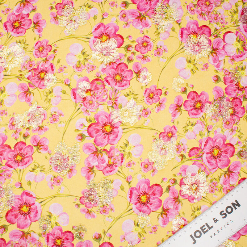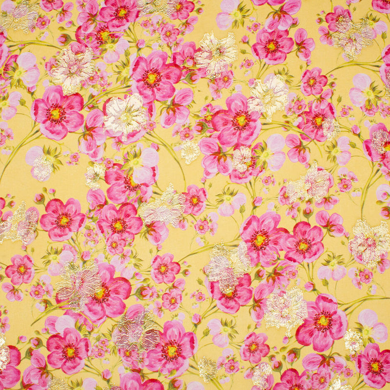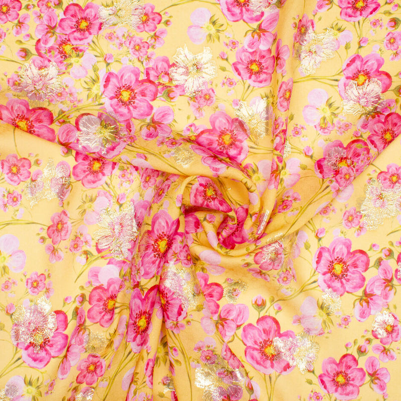 Pink Pansy Printed Metallic Yellow Silk Georgette (A 2.90m Piece)