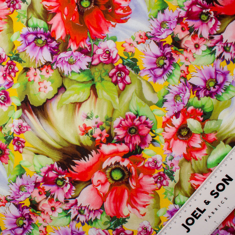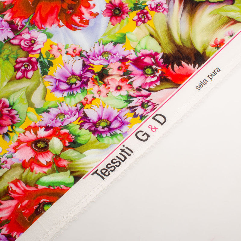 Pink & Red Floral Printed Yellow Silk Crêpe de Chine Fabric