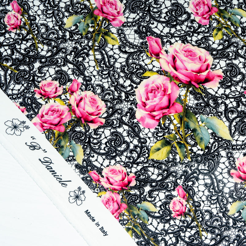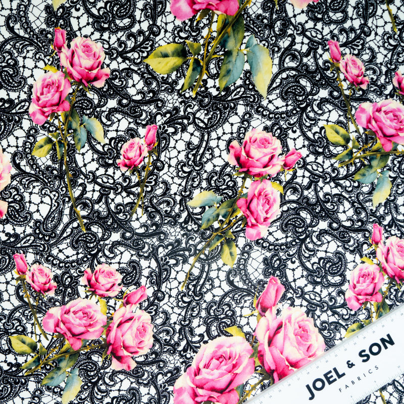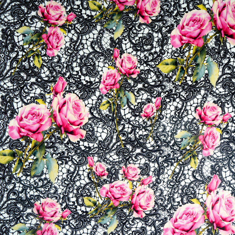 Pink Rose & Black Lace Printed Pure Silk Crêpe
