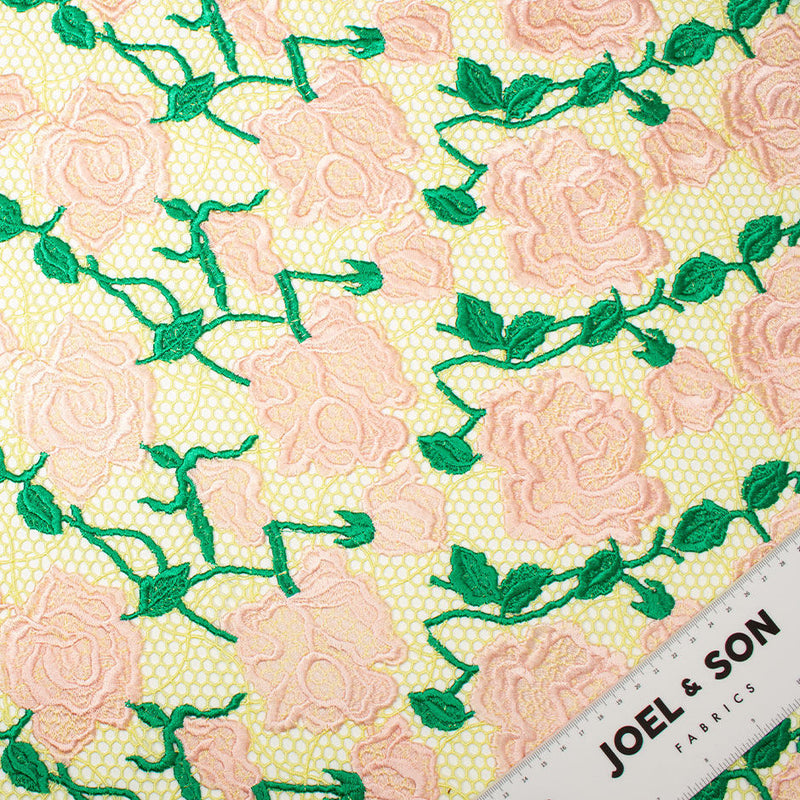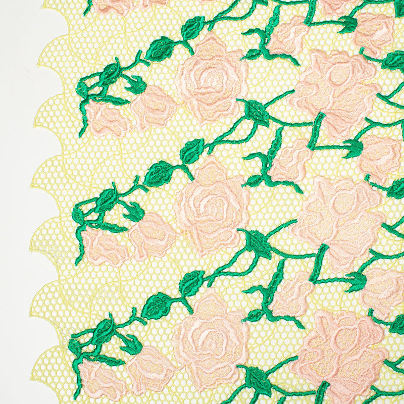 Pink Rose Embroidered Soft Yellow Guipure Lace