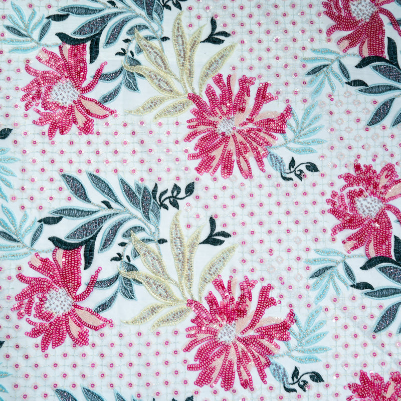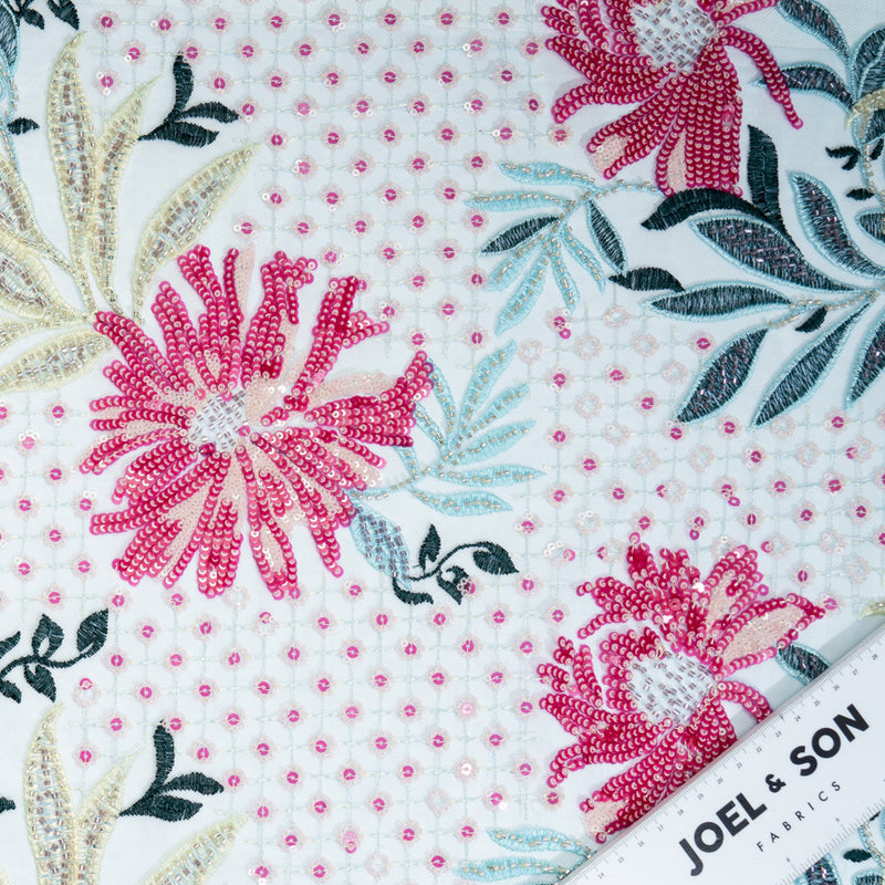 Pink & Yellow Floral Bead Embroidered Blue Tulle