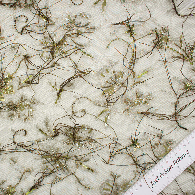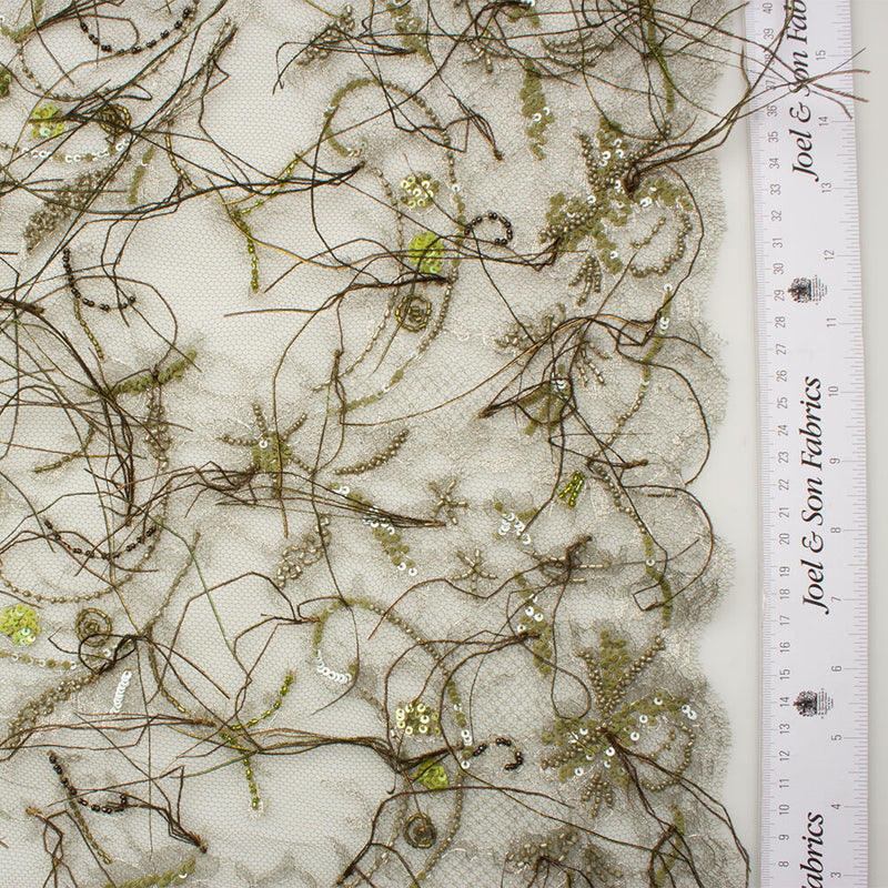 A stunning olive green lace with beading, metallic thread and feather accent. The last 1.70m are now available as a piece only. Originally priced at £329.90 per metre, this last remnant is now available for £385.00. (115cm wide).