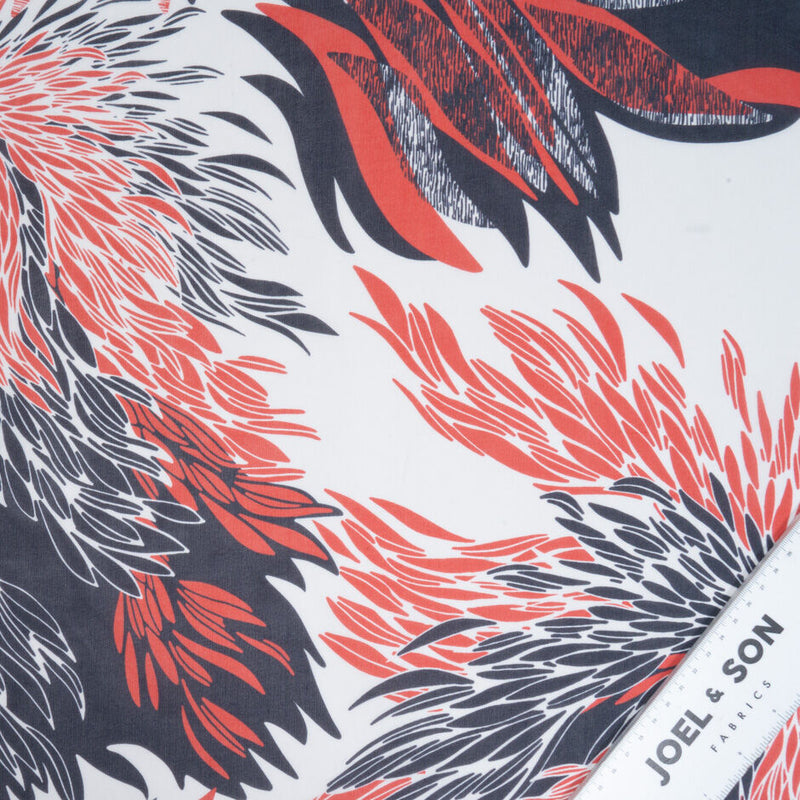 A red and navy blue abstract floral print on a white silk georgette by Abraham. Made in Italy, a lightweight balanced woven sheer fabric. Ideal for giving any dress a floating and elegant appearance and the perfect blouse or dress weight.
