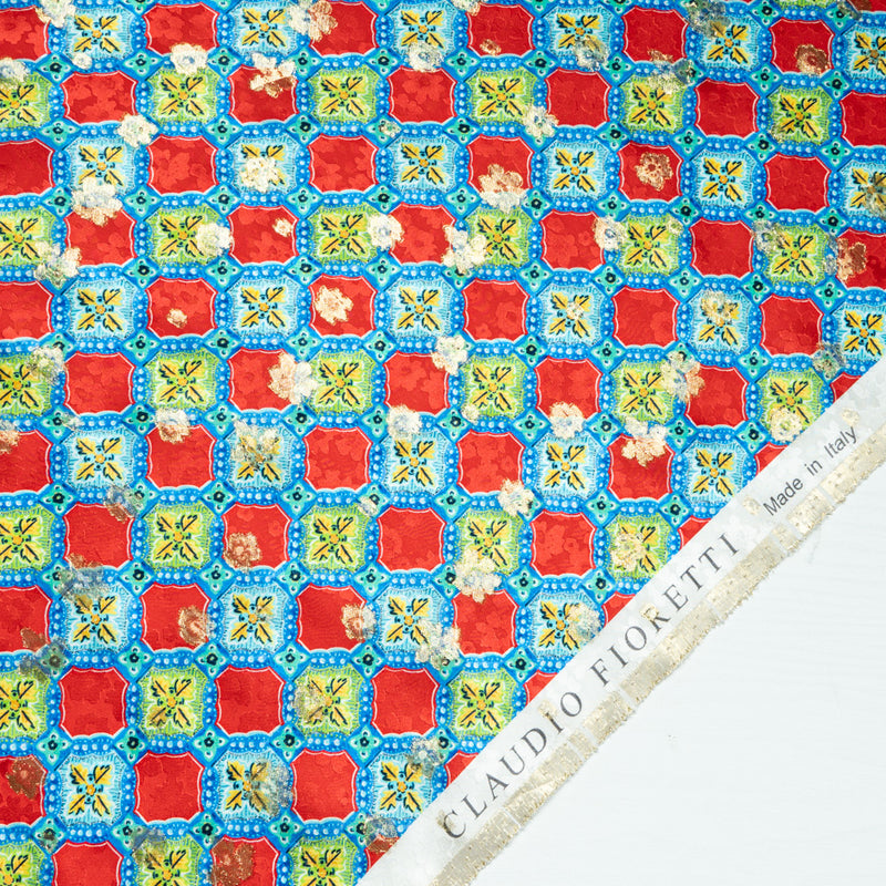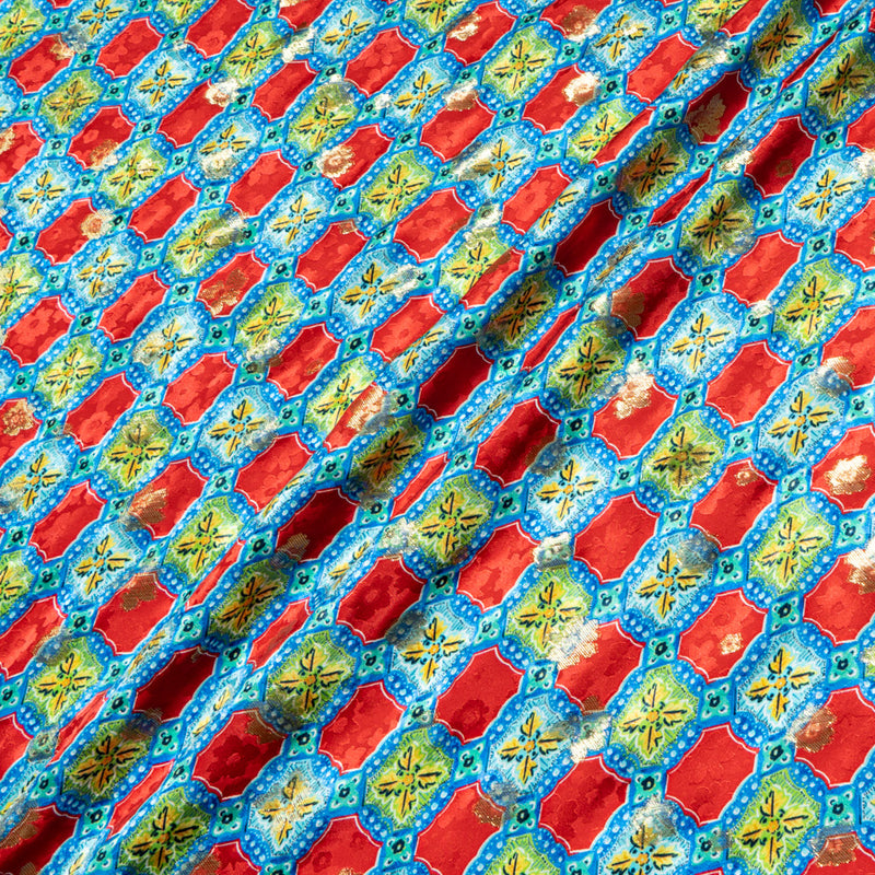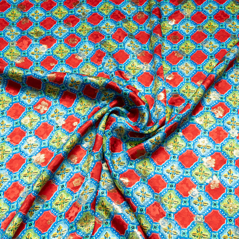 Red & Blue Tile Printed Gold Metallic Silk Jacquard