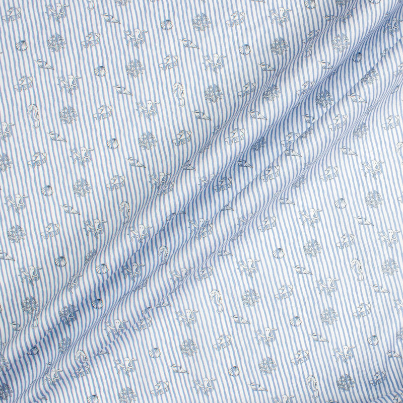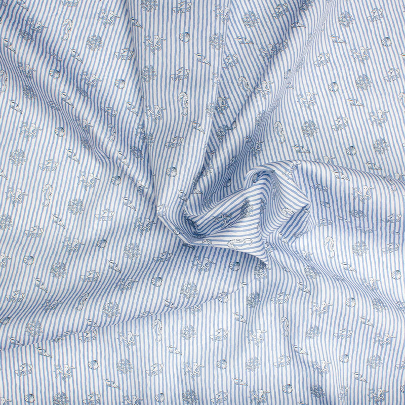 A fun sea creatures print and blue free style striped white shirting cotton. This pure cotton fabric is ideal for fun summer shirting, shorts or nightwear.