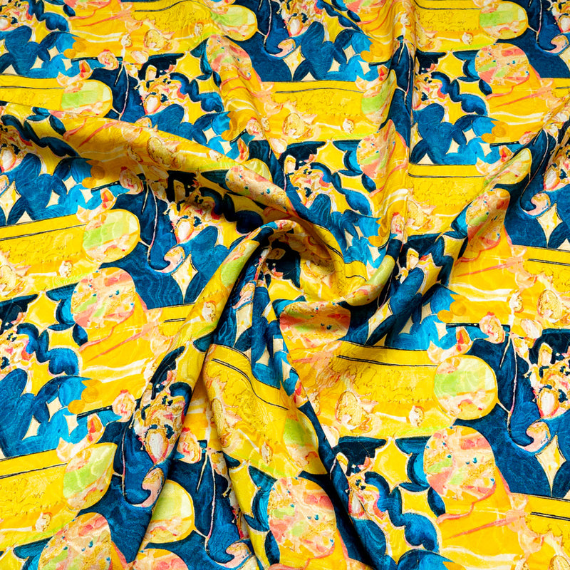 Yellow & Blue Abstract Printed Silk Jacquard