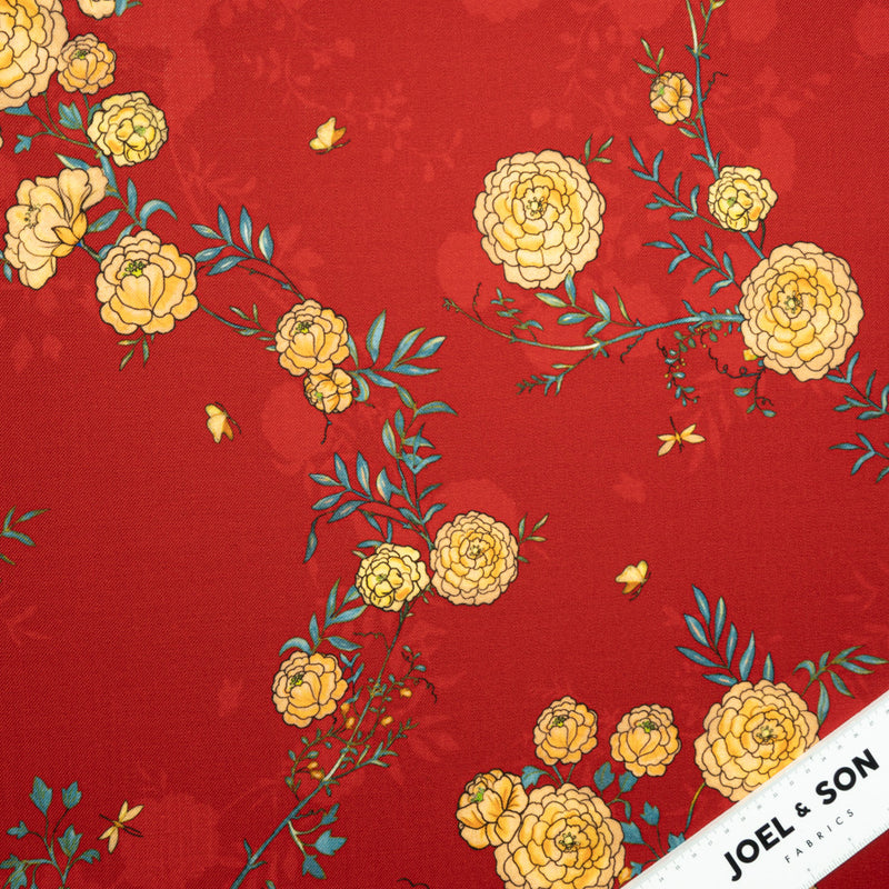 Yellow Floral Printed Red Pure Merino Wool