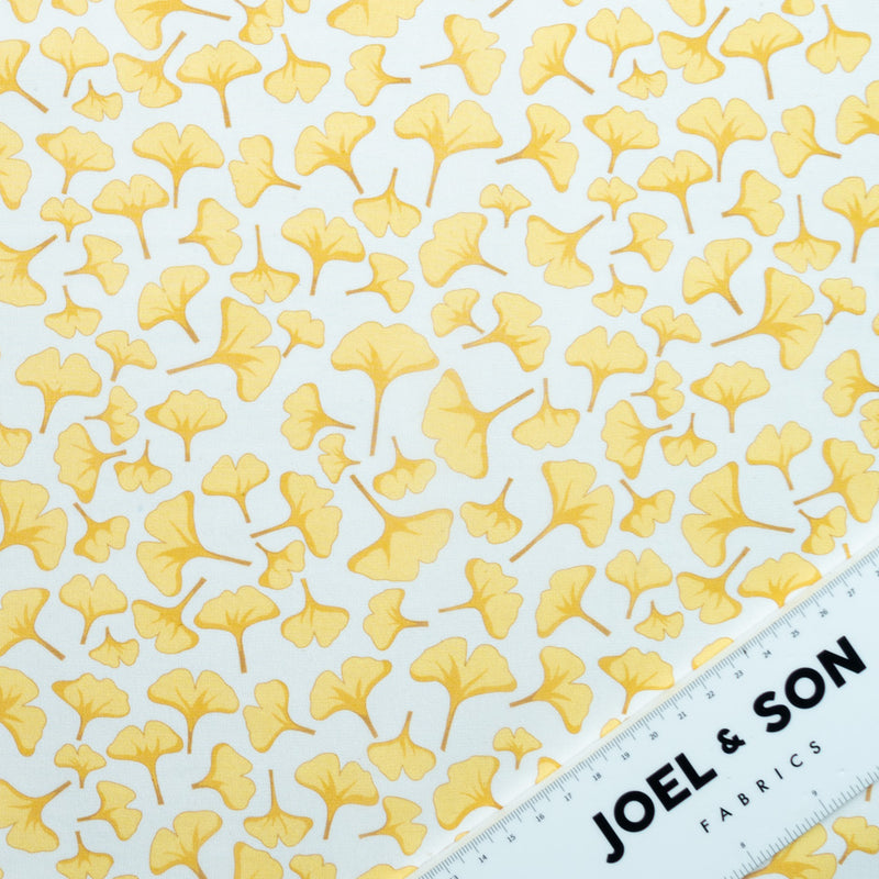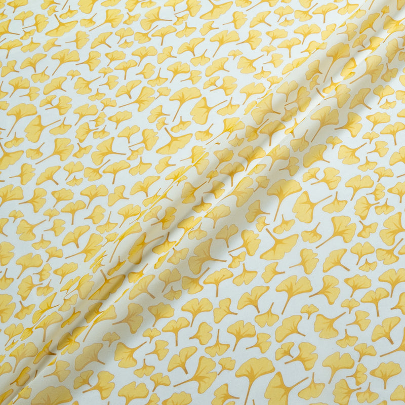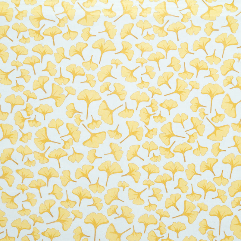 Yellow Ginko Leaf Printed White Pure Silk Georgette